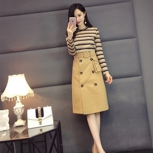 • 버버리 스트라이프 상의 단추장식 치마 세트