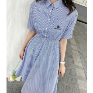 • 발렌시아가 BALENCIAGA 2021 SS 로고 카라 스트라이프 포켓 여성 원피스 커스텀급