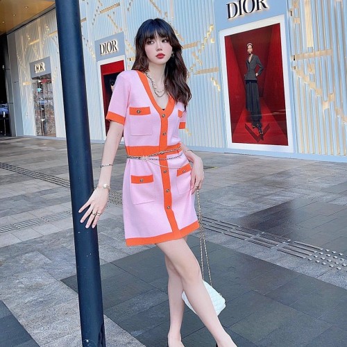 • 샤넬 CHANNEL 2023 SS 스트라이프 라인 포켓 핑크 여성 원피스 커스텀급