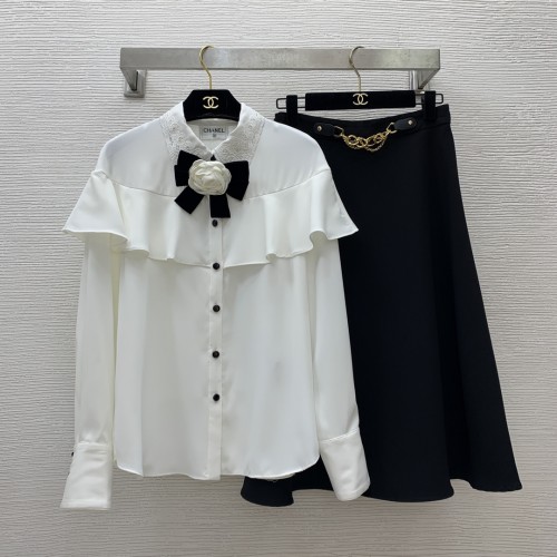 • 샤넬 CHANEL 2024 SS 레이스 까멜리아 프릴 블라우스 스커트 여성 세트 커스텀급