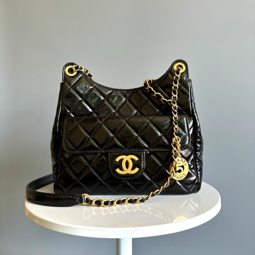 • 샤넬 CHANEL 2024 SS 오일 왁스 블랙 퀄팅 골드메탈 호보백 커스텀급