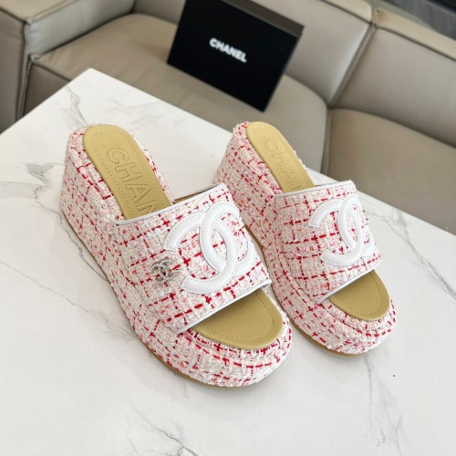 • 샤넬 CHANEL 2024 SS 체크 트위드 연핑크 여성 웨지힐 슬리퍼 커스텀급