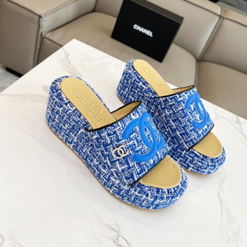 • 샤넬 CHANEL 2024 SS 체크 트위드 블루 여성 웨지힐 슬리퍼 커스텀급
