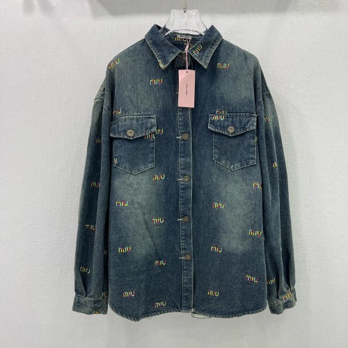 • 미우미우 MIUMIU 2024 SS 캐릭터 로고 자수 카라 포켓 여성 청셔츠 커스텀급
