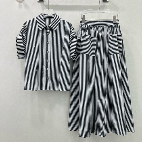 • 샤넬 CHANEL 2024 SS 캐릭터 로고 스트라이프 카라 블라우스 치마 블랙 여성 세트 커스텀급